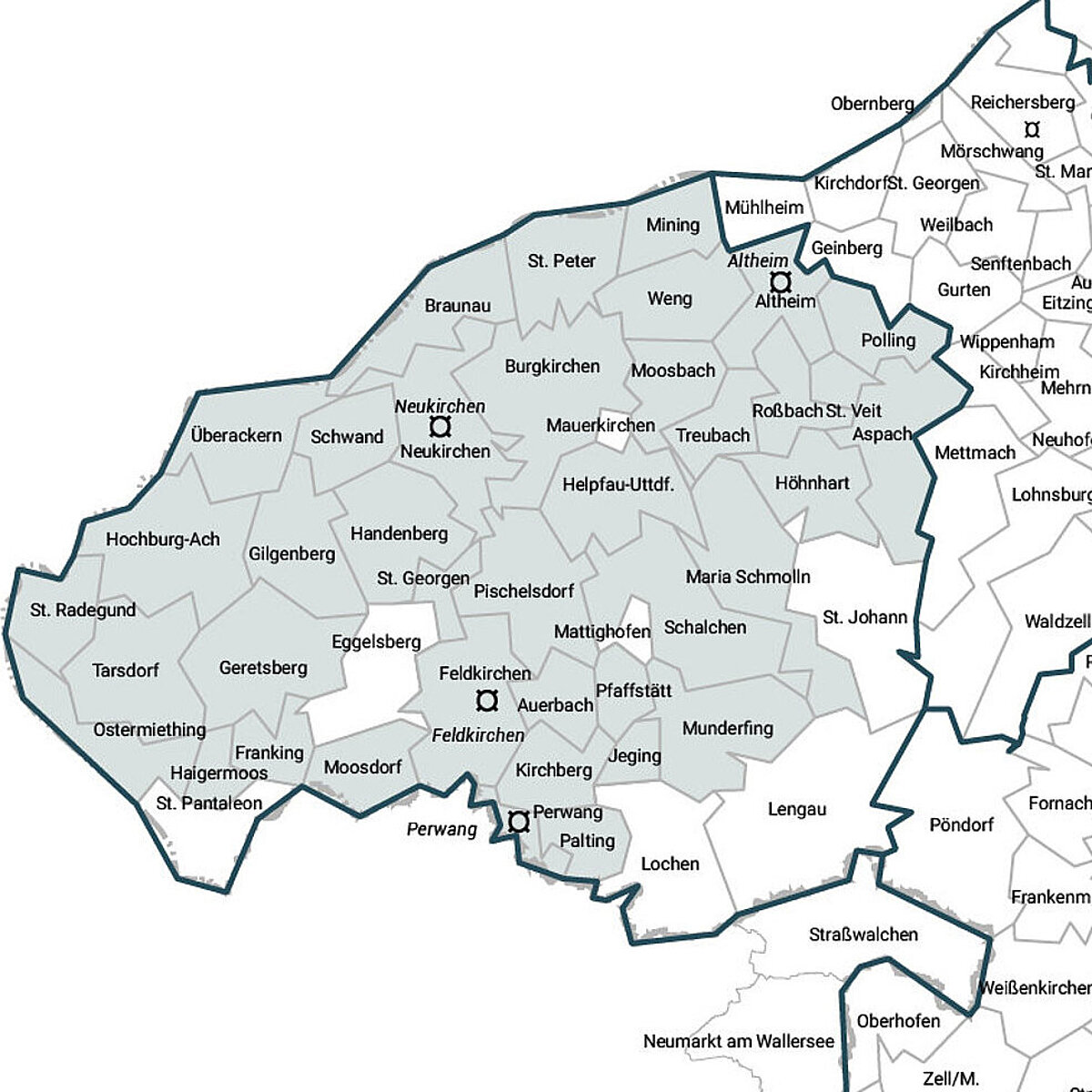 Altheim, Aspach, Auerbach, Braunau am Inn, Burgkirchen, Feldkirchen bei Mattighofen, Franking, Geretsberg, Gilgenberg, Haigermoos, Handenberg, Helpfau-Uttendorf, Hochburg-Ach, Höhnhart, Jeging, Kirchberg bei Mattighofen, Maria Schmolln, Mining, Moosbach, Moosdorf, Munderfing, Neukirchen an der Enknach, Ostermiething, Palting, Perwang am Grabensee, Pischelsdorf am Engelbach, Polling im Innkreis, Roßbach, St. Georgen am Fillmannsbach, St. Peter am Hart, St. Radegund, St. Veit im Innkreis, Schalchen, Schwand im Innkreis, Tarsdorf, Treubach, Überackern, Weng im Innkreis